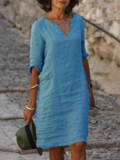 Cotton And Linen V-Neck Vintage Solid Color Dress